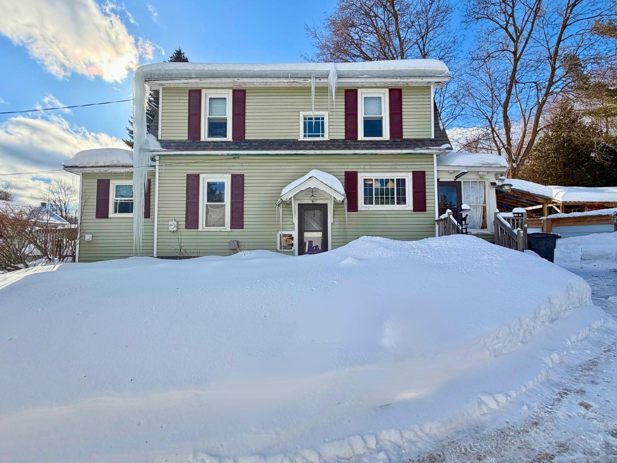 Make this updated Colonial your next move. Located in a small village setting within the Adirondack Park, this home offers 3 bedrooms and 2 full baths with a practical layout and thoughtful updates throughout. The kitchen features eco-glass countertops and newer cabinetry that flows seamlessly into the dining room, creating an easy transition for everyday living and entertaining. From there, the living room showcases original hardwood floors, built-ins, and a gas fireplace as a focal point. A beautiful staircase accented by stained glass adds timeless character. The former front porch has been converted into a functional entryway featuring a main-floor laundry room and a full bath with a shower and soaking tub, highlighted by a crystal chandelier for a touch of luxury, and the space is complete with a repurposed sink and handmade vanity. Two barn doors add both character and functionality to the space. Upstairs are three bedrooms and additional full bathroom. Recent improvements include but not limited to an on-demand boiler, new vinyl siding, and several updated light fixtures. Washer/dryer combo included. Outside, enjoy a fenced-in backyard, screened-in porch (hot tub not included), and a 10x12 insulated shed with power currently used as a gym. Coming soon: primary bedroom photo and pre-home inspection report. Close to Chazy Lake and short Drive to Plattsburgh, I-87 and Lake Champlain. *No Showings until March 14, 2026.