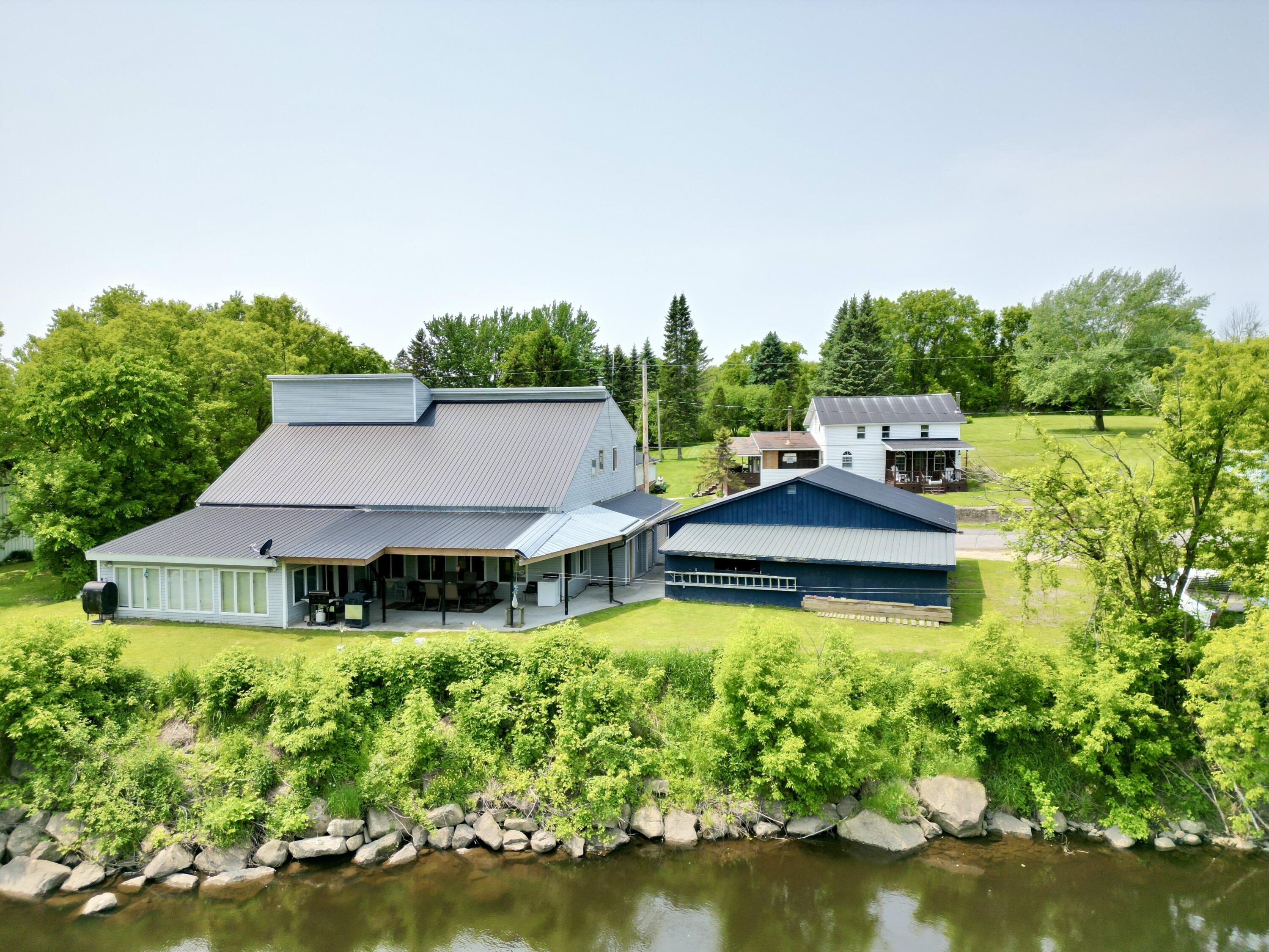 Welcome to 14 Hopkins Point Road -- a 3,675 sq ft waterfront home on the Little Salmon River with direct boat access to the St. Lawrence. This spacious and thoughtfully updated property offers 3 bedrooms, 3 full bathrooms, and soaring 24-foot cathedral ceilings in the main living area.The home features a large custom kitchen with oak cabinetry, stainless steel appliances, and an oversized island, perfect for entertaining. The expansive living and dining rooms offer abundant natural light and open-concept flow. The primary bedroom includes a private ensuite bathroom with soaking tub.Major updates include a new roof, high-efficiency propane boiler, and whole-home water treatment system. A detached two-stall garage, formerly used as a fully functioning auto repair garage, offers excellent potential for hobbyists, storage, or conversion into a workshop or studio space.Located near the Canadian border, this property combines privacy, space, and scenic waterfront access in a quiet setting. Ideal for full-time living, a seasonal retreat, or income-producing rental property.