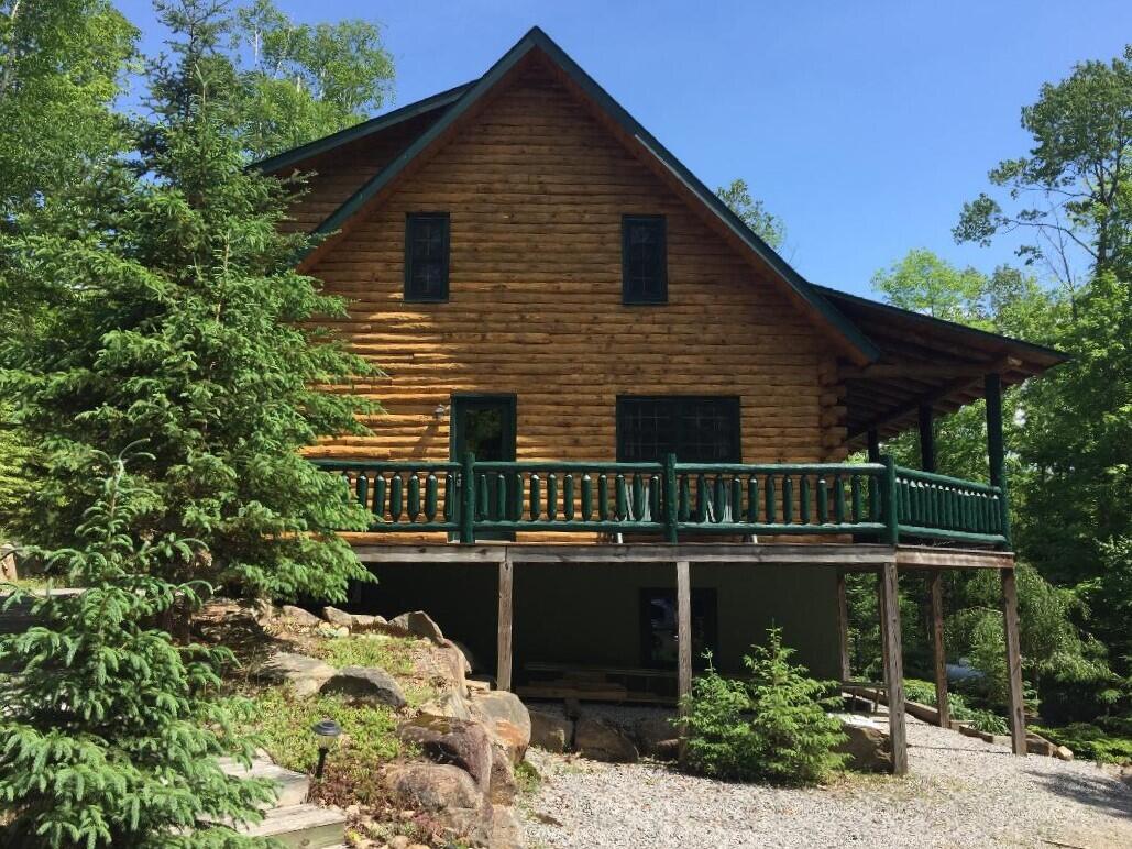 Real Log Home - This well-maintained log home sits on 2.5 acres which borders the Siamese Ponds Wilderness, offering access to over 100,000 acres of state forest preserve. Relax and take in the outdoors from the enclosed screen porch, covered deck, or firepit area. Inside, open floor plan with dining area, kitchen including island and pantry, living room featuring vaulted ceilings with exposed log beams and soapstone woodstove. Able to accommodate 8 with bedroom and full bath on each floor plus sleeping loft. Additional highlights include walk-out basement, whole-house automatic generator, most furnishings included, and the option to purchase snowmobiles for year-round adventure.