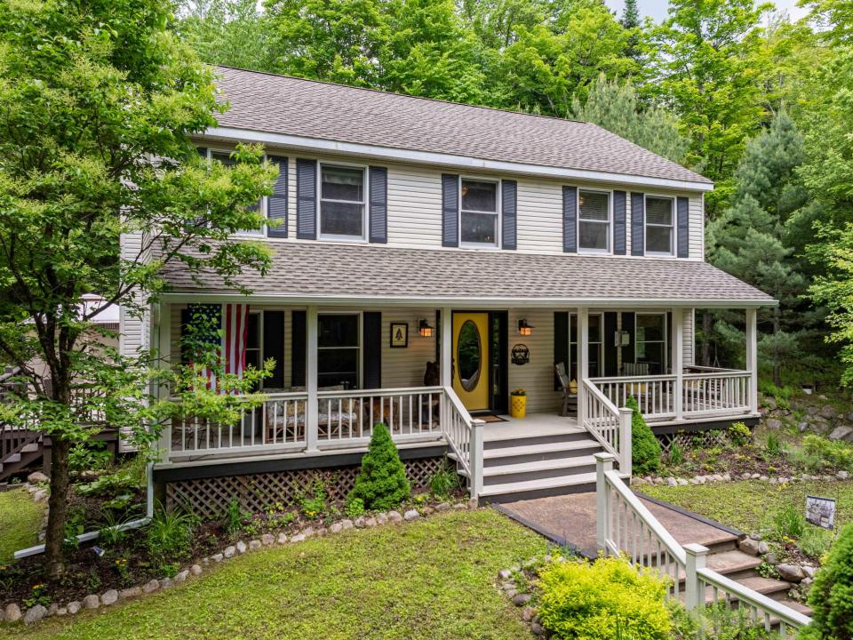 This beautiful Harvest Home is built for year round living. With four generous bedrooms, one a primary ensuite, there are two living rooms, kitchen with breakfast bar, a dining room. Step out to a private deck with screened room, on the side and rear. In front is a covered grandmothers porch. Besides the dual, drive in garage, there is a separate, detached garage. The separate garage is 36 X 40, can be heated, and includes a work bench and vehicle lift. Another 9X9 shed creates more storage. This offering has been well maintained and kept up to date. The roof is 2 years old, new gutters were installed in '24 and the septic was pumped in 2024. The porch has new railings and rungs and new steps. The location couldn't be better for snowmobiling, access to the Town of Inlet and access to a marina on Fourth Lake.