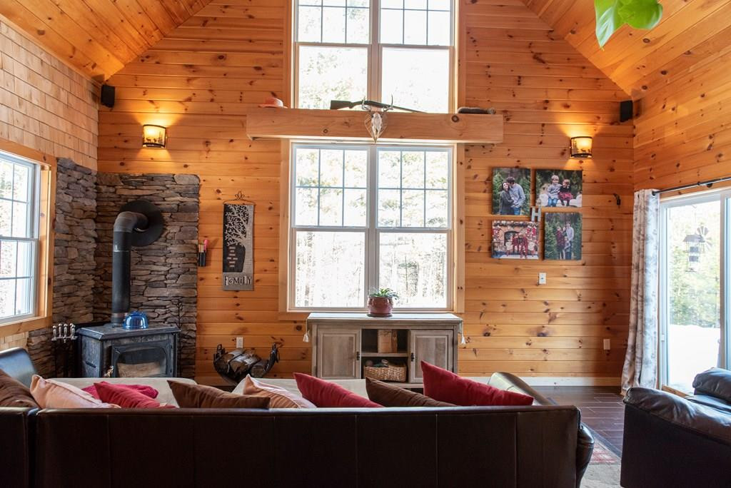 Beautifully curated Adk. home built on 3.2 Acres. From the moment you enter the home you will notice the vaulted ceilings with exposed beams, stunning balcony and a custom-built kitchen. The faux black walnut ceramic tile with in-floor radiant heat on the first floor helps evenly distribute the heat while keeping an authentic Adk feel. The Great Room features a cathedral ceiling with an abundance of natural light and views. Serving as the main gathering place of the home. Here you can warm up to stone surround wood stove in the winter months, walk directly out to the deck in the summer months, or just relax infront of the built-in home theater system. Upstairs features vaulted ceilings in the master bedroom and fully customized bathroom. An oversized two car garage with high ceilings and in-floor radiant heating making this a great space to double as a workshop. There are many more great details to this home as it was built with both beauty and function in mind.