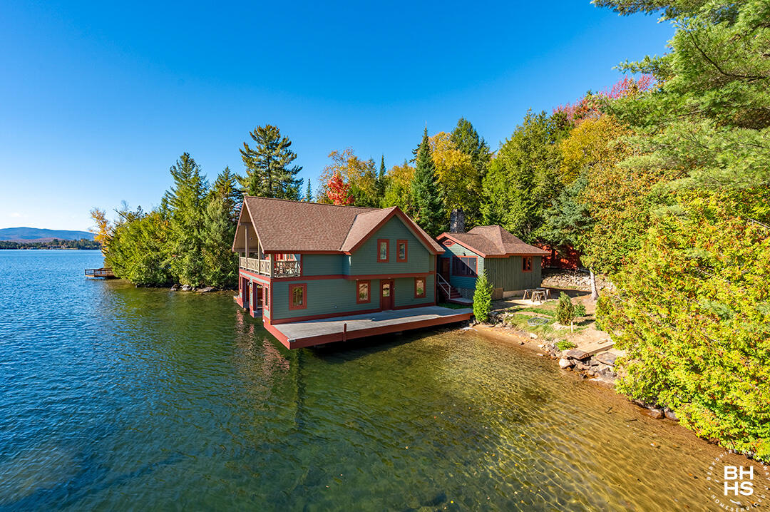 Buck Bay South is a boathouse constructed in the early 2000s with a connected 1930s cabin, set on Buck Island. This distinctive waterfront property blends modern comfort with classic Adirondack charm, highlighted by a spacious porch with sweeping views of Pulpit Rock. The property offers three bedrooms and two full bathrooms across its thoughtfully designed living spaces.The boathouse features an expansive living area with vaulted ceilings and a striking stone fireplace, creating a dramatic yet inviting gathering space. It also includes two covered boat slips and a large sauna--offering both comfort and immediate access to the water.The attached cabin has been thoughtfully renovated to preserve its character while incorporating modern updates. It features a full kitchen with new appliances, two full bathrooms, a new washer and dryer, and a screened porch. A second fireplace anchors the kitchen, bringing warmth and rustic charm to the heart of the space.Infrastructure improvements include spray foam insulation in the boathouse walls and ceilings, insulated windows, and electric baseboard heat supported by a 200-amp service. The cabin has been upgraded with a new roof, plumbing, and electrical systems. The property is serviced by a new engineered septic system and a combined 400-amp electrical service supporting both structures.An additional accessory building provides flexible space ideal for storage, a studio, or a gym.Buck Island is just a short boat ride from the mainland marina, providing convenient access while preserving the seclusion and privacy of an island setting. The two covered slips and sold mostly furnished. Easy to show !