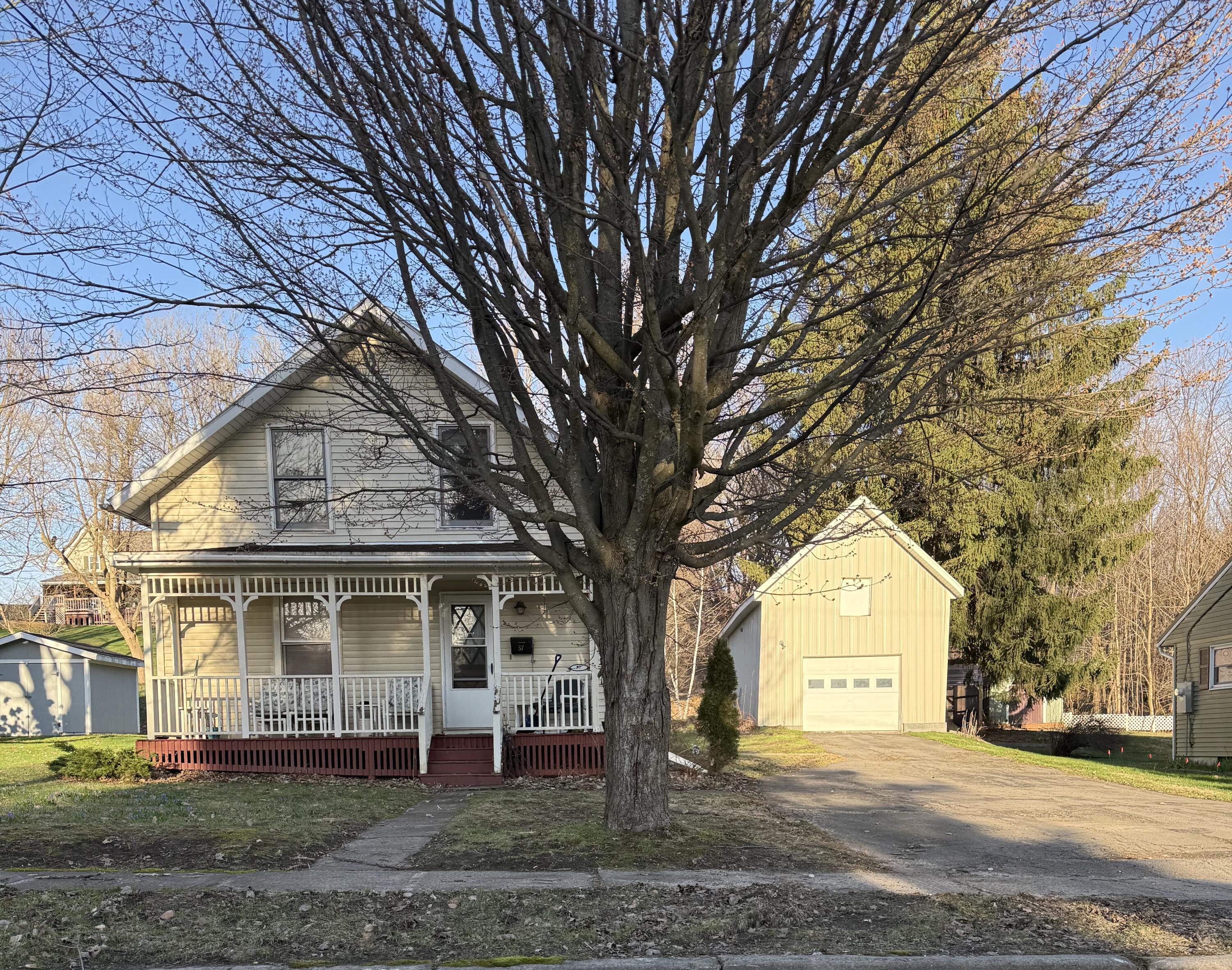 Whether you are looking for a cozy home or a good investment, this village property has plenty to offer with space, privacy, and flexibility. Over 1,100 sq. ft. with 2 to 3 bedrooms and a full bath. This lot goes all the way to the street behind, with potential to enter from both streets. A large detached garage with a full second floor, great for a workshop, storage, or extra space. Located on a quiet street and still close to village shops and conveniences.